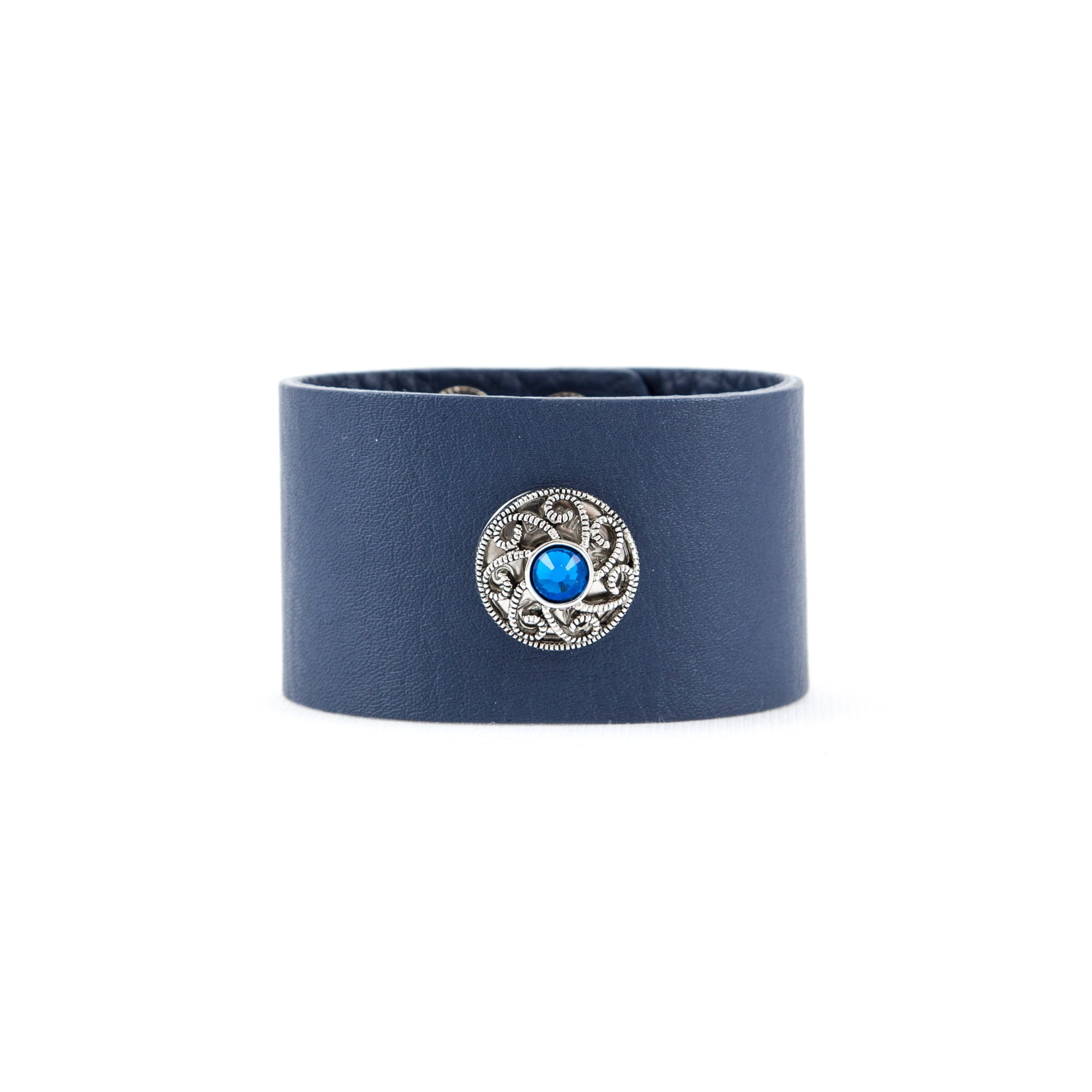Bransoletka na szerokim, granatowym pasku wykonanym ze skóry licowej z pojedynczym chunksem zawierającym błękitną cyrkonię. Granat to kolor morza i marynarzy, ale też symbol władzy. Bransoletka Marina z jednej strony przypomina morze i związaną z nim wolność, z drugiej stanowi idealne połączenie stylu boho i elegancji.